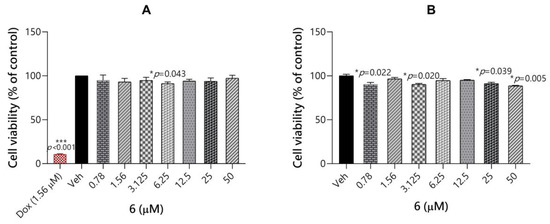 Toxicity evaluation of compound 6 and cytostatic drug doxorubicin (Dox) in HepG2 (A) and SH-SY5Y cells (B). Each point represents the mean ± SEM of two independent experiments, each of which consisted of three replicates per treatment group. Statistical analyses were performed using GraphPad Prism software 8.0. Statistical significance was evaluated by one-way ANOVA with post-hoc Dunnett test at significance level α = 0.05; p-values are detailed in the figure.