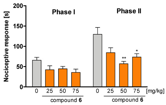 A commonly used screening method to test new molecules with analgesic potential is the formalin test. Local injection of formalin induces two phases of the nociceptive response. The early phase (I) is associated with immediate activation of the nociceptors mainly dependent on chemical stimulation of TRPA1 receptors and is related rather to acute neurogenic pain. The late phase (II) is the result of tissue damage, a subsequent inflammatory response, and sensitisation of the spinal reflex circuits. Furthermore, it has been suggested that formalin induces pathological changes that resemble those observed in nerve injury and neuropathic pain [72]. The biphasic response and a plethora of mechanisms involved in the nociceptive response to formalin make the formalin test a valuable tool in the assessment of the analgesic efficacy of a variety of compounds.