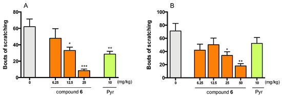 The localization of H4Rs in various immune and neuronal cells [4] suggests their involvement in the mechanisms of pain transduction, transmission, and perception. It has been proven that H4R ligands show analgesic properties in pain, especially of inflammatory origin [27,31]. Pain and pruritus are distinct unpleasant sensations, but, in many ways, they are closely related. Both sensations share many integral similarities such as largely overlapping mediators and receptors [69,70]. It has been reported that H4R antagonists effectively attenuate experimental pruritus [71]. The above-mentioned data encouraged us to test compound 6 in animal models of inflammatory pain and itch.