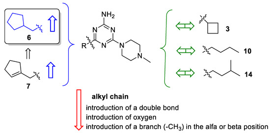 In the group of aliphatic derivatives (10–20; Table 2), the affinity was influenced by the presence of a methyl branch and/or a double bond in the main chain. Unbranched saturated aliphatic derivatives (10, 19) showed better affinity than branched compounds (11–14). An introduction of the methyl substituent into the butyl chain in the α- or ß- positions to the triazine ring resulted in a decrease in affinity (10 vs. 11 vs. 12). On the contrary, the presence of this substituent in the γ-position had little effect on affinity (14 vs. 10). The introduction of a double bond regardless of the position caused a decrease in affinity (10 vs. 15 vs. 16 or 19 vs. 20). In contrast, the presence of this bond in compounds with branching at the α- and ß-positions slightly increased receptor affinity (17 vs. 11 and 18 vs. 12). Thus, the presence of the double bond was profitable for the branched derivatives and unprofitable for straight-chain compounds.