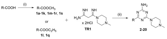 Compounds were synthesized as shown in Scheme 1. Commercially unavailable esters (1a-1i, 1k-1l, 1n-1p, 1r, and 1t) were prepared from proper carboxylic acids to methyl esters by refluxing in methanol in the presence of sulfuric acid as described previously [61]. Next, crude and commercially available (1j, 1m, 1q and 1s) esters were coupled with TR1 (4-methylpiperazin-1-yl biguanide dihydrochloride) in a freshly prepared sodium methoxide as described previously to give desired 1,3,5-triazines 2–21 [44]. For all compounds, spectral analysis (1H NMR and 13C NMR) and mass spectrometry (LC/MS) confirmed their structures.