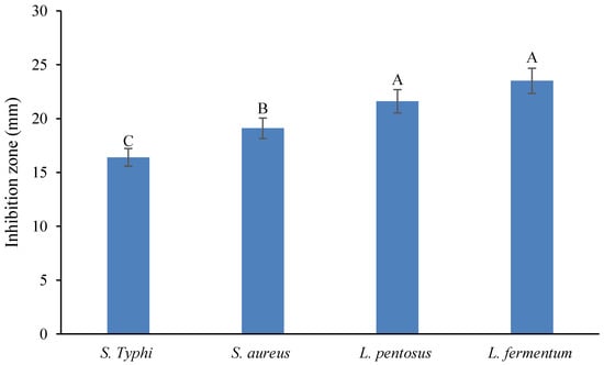 The antibacterial activities of REO are shown in Figure 1. According to the figure, L. fermentum (IZ of 23.5 mm) and S. Typhi (IZ of 16.4 mm) had the highest and lowest sensitivity to REO, respectively. In general, gram-positive bacteria (L. fermentum, Lactiplantibacillus pentosus and S. aureus) exhibited larger inhibition zones than S. Typhi as a gram-negative bacterium.