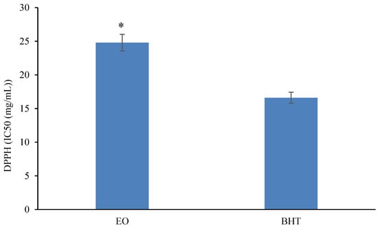 The EC50 parameter is widely applied to determine the free radical scavenging activity. The lower the EC50 value, the higher the antioxidant capacity [25]. Figure 2 shows the antioxidant activity (based on the DPPH scavenging assay) of REO compared to BHT as a synthetic antioxidant. Accordingly, the free radical scavenging activity of the REO was measured at 24.8 mg/mL, while the IC50 value of BHT was 16.6 mg/mL. In other words, the BHT antioxidant capacity was significantly (p ≤ 0.05) higher than that of the REO. Our results were concordant with the results of Hashemi et al. [26] and Goudoum, Abdou, Ngamo, Ngassoum and Mbofung [25], who found that BHT had a higher free radical scavenging activity than the studied EOs. The terpenoid compounds of the REO are the main reason for its high antioxidant capacity. Among the most effective antioxidant compounds of rosemary, cyclic diterpene diphenols, carnosol and carnosolic acid have been mentioned. Moreover, a compound like 1,8-cineole, at 14.1% in this essential oil, can contribute to the high antioxidant activity of REO [5,8].