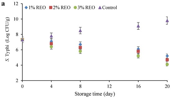 The antimicrobial effects of different concentrations of REO on pathogenic (S. Typhi (a) and S. aureus (b)) and spoilage bacteria (L. fermentum (c) and L. pentosus (d)) in Sarshir during the cold storage period.