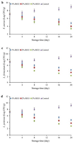 The antimicrobial effects of different REO concentrations on food-borne pathogens (S. Typhi and S. aureus) and spoilage bacteria (L. fermentum and L. pentosus) during the cold storage period are shown in Figure 3. The number of S. Typhi in the control increased significantly (p ≤ 0.05) from 7.3 (Log CFU/g) on day zero to 9.8 (Log CFU/g) on day 20, while in samples containing REO, the count of this pathogen decreased with increasing storage time (Figure 3a). The control had the highest number and the sample containing 3% REO had the lowest number of S. Typhi. As shown in Figure 3b, the count of S. aureus in the control also increased significantly (p ≤ 0.05) during refrigeration (ranging from 7.1 to 9 (Log CFU/g)), while its numbers in the samples containing different concentrations of REO had a downward trend. The number of S. aureus in the control and the sample containing 3% REO was considerably (p ≤ 0.05) higher and lower than its number in other samples, respectively. With increasing storage time, the population of L. fermentum in Sarshir without REO increased significantly (p ≤ 0.05) from 7.2 (Log CFU/g) on day 0 to 9.2 (Log CFU/g) on day 20, but the count of this lactic bacterium decreased significantly (p ≤ 0.05) in samples containing 1 to 3% REO (Figure 3c). The control had the highest number of L. fermentum, while the lowest count was detected in Sarshir containing 3% REO. From the fourth day onwards, the number of L. fermentum was significantly (p ≤ 0.05) different in samples containing different amounts of REO. According to Figure 3d, the number of L. pentosus in the control sample increased significantly (p ≤ 0.05) during cold storage and reached from 7.2 (Log CFU/g) on the day zero, to 9.3 (Log CFU/g) on the 20th day of the storage period. On the other hand, the numbers of this bacterium in the samples containing REO decreased significantly (p ≤ 0.05). The control and the sample containing 3% REO had the highest and lowest numbers of L. pentosus, respectively. The difference between the samples containing REO was also significant (p ≤ 0.05) in terms of the count of L. pentosus during the cold storage period. In general, increasing the concentration of REO caused a significant (p ≤ 0.05) decrease in the number of pathogenic and spoilage bacteria during the cold storage period. In addition, the highest reduction in the number of bacteria in the samples containing REO occurred in the interval from 16 to 20 days.