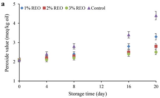 To evaluate the progress of lipid oxidation in food products, two indices of peroxide and anisidine are used. The peroxide index determines the primary oxidation of lipids. Figure 4a shows the changes in the peroxide value of the samples during refrigerated storage. As can be observed, the peroxide values of all samples increased with time, and this increase was significant (p ≤ 0.05) at the end of the storage period compared to the beginning. The highest degree of lipid oxidation was found in the control and Sarshir containing 3% REO had the lowest peroxide value. By increasing the concentration of REO from 1 to 3%, the peroxide value of the samples diminished, which was significant (p ≤ 0.05) at the end of the storage time.