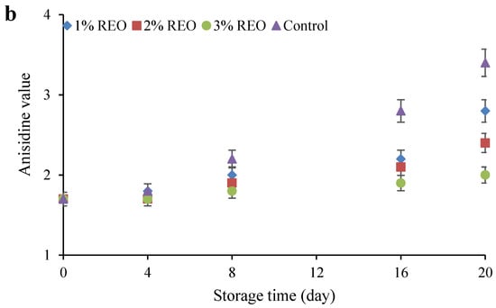 The anisidine value determines the concentration of secondary oxidation products. Figure 4b shows the changes in anisidine values of the samples as a function of refrigeration time. Accordingly, increasing the storage time caused significant (p ≤ 0.05) increases in the anisidine values of the samples. The highest anisidine value was measured in the control, while the sample containing 3% REO had the lowest anisidine value. With increasing concentration of REO, the anisidine value of the samples containing essential oil decreased, which was especially significant (p ≤ 0.05) at the end of the cold storage period.
