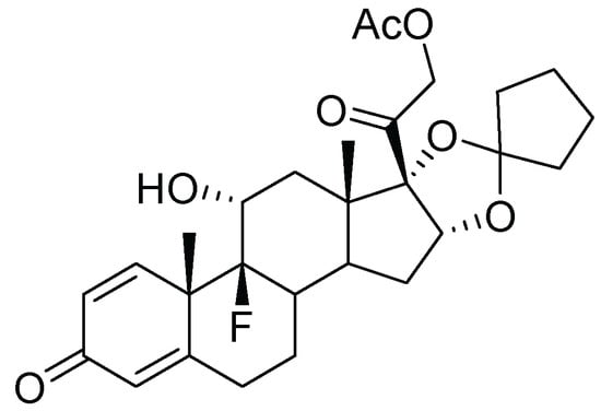 Amcinonide (Figure 5) is a topical corticosteroid approved in 1979 for the treatment of various inflammatory dermatological conditions such as atopic dermatitis and allergic contact dermatitis. Amcinonide displayed high affinity to the glucocorticoid receptor which is thought to be the main biological target mediating its anti-inflammatory action. Binding to the receptor and its activation by amcinonide eventually leads to the induction of phospholipase A2 inhibitory proteins, which suppresses the production of arachidonic acid and the downstream production of prostaglandins as chemical mediators of inflammation [24].