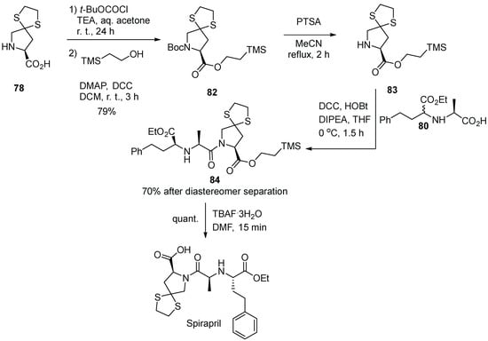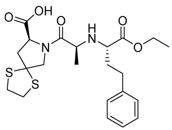 - Smith, E.M.; Swiss, G.F.; Neustadt, B.R.; McNamara, P.; Gold, E.H.; Sybertz, E.J.; Baum, T. Angiotensin Converting Enzyme Inhibitors: Spirapril and Related Compounds. J. Med. Chem. 1989, 32, 1600–1606. [Google Scholar] [CrossRef]
