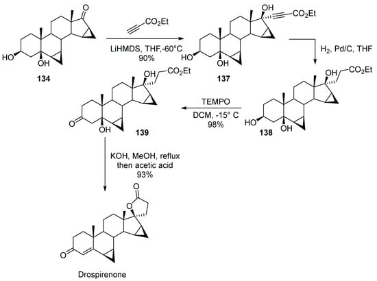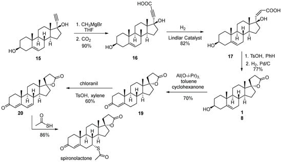 The first industrial synthesis of spironolactone was reported in 1957–1959 by Cella and co-workers of G. D. Searle and Co. [6,7,8]. The synthesis commenced with previously reported ethynyl steroid building block 15. It was carbonylated at the alkyne terminus by treatment with methyl magnesium bromide, followed by quenching with carbon dioxide. Hydrogenation of alkyne 16 over the Lindlar catalyst elaborated the propionic acid side chain in 17 required for the formation of the spirocyclic lactone at the next step. Cyclization on treatment with p-toluenesulfonic acid yielded unsaturated lactone which was hydrogenated over palladium on carbon to yield spirocyclic lactone 18.