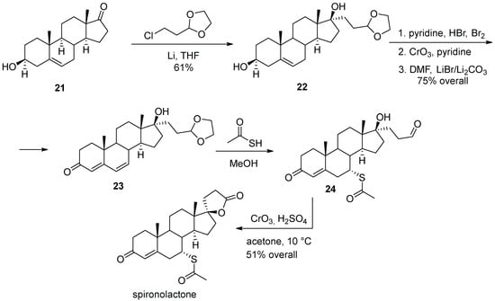 Another synthetic approach of spironolactone was patented in 1980 by Ciba Geigy scientists [9]. The synthesis stems from dehydroepiandrosterone (21), which was treated with 3-chloropropionaldehyde ethylene acetal and lithium to furnish tertiary alcohol 22 in diastereoselective fashion. The following sequence of steps (which proceeded in 75% overall yield) included bromination of the double bond, oxidation of the secondary alcohol to ketone and, finally, base-promoted double dehydrobromination, which led to α,β,γ,δ-unsaturated ketone (androstadienone) 23. Interestingly, the conjugate addition of thioacetic acid was in this case performed prior to the elaboration of the spirocyclic lactone in the last step. Thioacetic acid also caused the deprotection of the aldehyde to furnish 24. Oxidation of the aldehyde to the carboxylic acid in the presence of sulfuric acid brought about the closure of the lactone ring and led to the formation of spironolactone in 51% yield from 23 (Scheme 4).