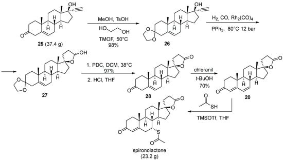 A fundamentally different route to spironolactone performed in multigram scale was developed by the Chemical Process Research and Development scientists at The Upjohn Co. in the late 1980s [10]. The synthesis relied on the readily available ethynyl steroid building block 25, the ketone group of which was protected as ethylene glycol ketal in the first step. The key transformation which led to the formation of spirocyclic lactol intermediate 27 was rhodium-catalyzed hydroformylation at elevated temperature and pressure. Oxidation of 27 to lactone was achieved with PDC and the ketal protecting group was removed to afford 28. The formation of α,β,γ,δ-unsaturated ketone 20 was achieved with chloranil (vide supra). and conjugate addition of thioacetic acid (catalyzed by TMSOTf) at the δ-position furnished spironolactone (Scheme 5).