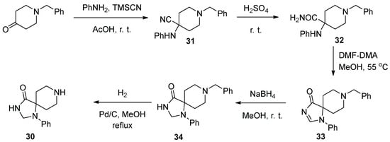 Fluspirilene is an old drug, and reviewing the vast patent literature on its synthesis would be tedious. Instead, we will focus on the most notable cases of fluspirilene assembly from the relatively recent literature. For instance, an efficient synthesis of the key spirocyclic building block 30 needed for the synthesis of the drug was published in 2018 by a team of Italian and Polish scientists [14]. The synthesis commenced with 1-benzyl piperidin-4-one, which was involved in the Strecker reaction with aniline and trimethylsilyl cyanide to give nitrile 31. The latter was hydrated in sulfuric acid and the resulting α-anilino carboxamide 32 was condensed with N,N-dimethylformamide dimethyl acetal to form spirocyclic imidazolinone 33. The C-N double bond in 33 was reduced to give imidazolidinone 34 and the benzyl group was removed by hydrogenation to give the target spirocycle 30 (Scheme 7).