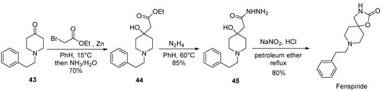 One of the early patents, obtained by the Italian Voghera company for the synthesis of fenspiride, describes the assembly of the target molecule starting from 1-phenethyl piperidin-4-one (43), which was involved in the Reformatsky reaction with ethyl bromoacetate. After the conversion of the resulting β-hydroxy ester 44 to hydrazide 45, the latter was diazotized, which triggered a Curtius rearrangement of the intermediate acyl azide, and the isocyanate product of the rearrangement was trapped, intramolecularly, by the nearby hydroxy group, to give fenspiride (Scheme 10) [20].