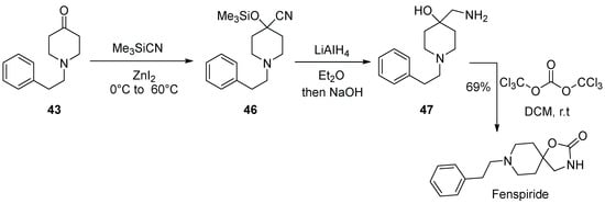 In 1994, a Mexican group disclosed an alternative approach to elaborating the spirocyclic oxazolidinone based on 1-phenethyl piperidin-4-one, which includes the Strecker-type reaction of the ketone with trimethylsilyl cyanide. The resulting O-silylated a-hydroxy nitrile 46 was subjected to reduction with lithium alumohydride to give β-amino alcohol 47. The latter was treated with trichloromethyl carbonate, which donated the carbonyl group and resulted in the closure of the oxazolidinone ring of fenspiride (Scheme 11) [21].