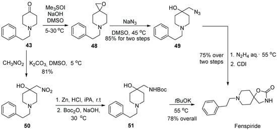 In 2019, the Indian company Emcure Pharmaceuticals jointly with a University of Pune group published a completely novel route to fenspiride which is based on the nitro aldol reaction and is amenable to industrial-scale production of the drug substance [22]. In fact, the researchers disclosed two possible approaches to fenspiride for comparison, and reached a conclusion that the nitro aldol route was preferred from the standpoint of pharmaceutical production. In the first approach, Corey–Chaykovsky epoxidation gave epoxide 48, which was opened up by sodium azide to give β-azido alcohol 49. Reduction by hydrazine (presumably to alcohol 47) and treatment with CDI (the donor of the carbonyl) afforded fenspiride. In the second, preferred, approach, ketone 43 was condensed with nitromethane anion and the resulting nitro compound 50 was reduced to the respective amine and Boc-protected to afford intermediate 51. Deprotonation of the hydroxy group in the latter with potassium tert-butoxide triggered intramolecular displacement of the tert-butoxy group and ring closure to fenspiride (Scheme 12). Additionally, the second route was performed on a large scale, starting with 1 kg of compound 50 to furnish 880 g of fenspiride.