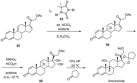 Unfortunately, synthetic routes to amcinonide are poorly described in the literature. Even the original patent issued to the American Cyanamide company [25] features little synthetic detail. An industrial synthesis of amcinonide patented by an Indian company in 2018 [26] is described in sufficient detail. It starts with readily available natural steroid 2-((10S,13S,14S)-10,13-dimethyl-3-oxo-6,7,8,10,12,13,14,15-octahydro-3H-cyclopenta[a]phenanthren-17-yl)-2-oxoethyl acetate (52). The latter is subjected to epoxidation of the non-conjugated double bond using 1,3-dibromo-5,5-dimethylhydantoin (dibromantin, 53) and aqueous perchloric acid, followed by the treatment of the resulting bromohydrin with potassium carbonate. Epoxide 54 is formed with high diastereoselectivity. The next step is dihydroxylation of the cyclopentene ring, which is brought about by potassium permanganate and formic acid in acetone. Finally, diol 55 is formed diastereoselectively, then subjected to the treatment with 70% hydrofluoric acid, followed by the addition of cyclopentanone. The net result of the latter step is epoxide opening with the fluoride anion and spirocyclic ketal formation leading to amcinonide (Scheme 13).