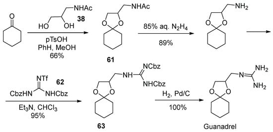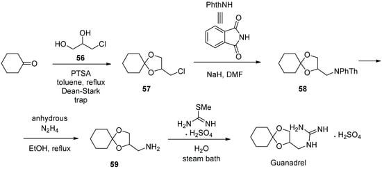 Guanadrel (Figure 6) is an anti-hypertension drug containing a guanidine moiety which was approved in 1979 [27]. It exerts its therapeutic action by blocking the sodium-dependent noradrenaline transporter, and thus is a typical adrenoblocker [28]. The industrial synthesis of guanadrel was patented in 1970 by its inventors [29]. In the first step, cyclohexanone undergoes ketalization with 3-chloro-1,2-propandiol (56), forming 2-chloromethyl-1,4-dioxyspiro[4,5]decane (57). The latter building block is used to alkylate phthalimide sodium salt to give the protected amine derivative 58. Removal of the phthalimide protecting group with hydrazine liberates the primary amino group in 59, which is reacted with S-methyl thiourea sulfate in aqueous medium on steam bath heating to give guanadrel as a sulfate salt (Scheme 14).