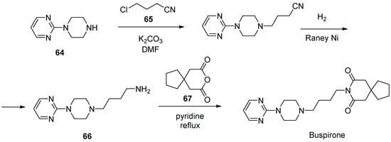 First synthesized in 1966 and approved for medical use in 1986 buspirone (Figure 7), a spirocyclic serotonin 5-HT1A receptor agonist is primarily used to treat anxiety disorders [31]. Several patented protocols for the preparation of buspirone [32,33,34], including industrial synthesis, have been reported in the literature.