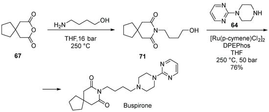 In 2019, Steven Ley and co-workers reported a continuous flow method to prepare buspirone which involves the direct alkylation of 1-(pyrimidin-2-yl)piperazine (64) with alcohol 71 via a Ru(II)-catalyzed hydrogen-borrowing approach (Scheme 18) [36].