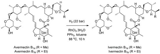 Ivermectin is an approximately 80:20 mixture of two individual macrocyclic lactone (macrolide) compounds, ivermectin B1a and B1b. These compounds are produced by hydrogenation of the C22 = C23 double bond of the mixture of avermectins B1a and B1b which are, in turn, produced by fermentation of Streptomyces avermitilis, the bacteria discovered in 1970 by Satoshi Ōmura, for which discovery he and William Campbell of Merck were awarded the Nobel Prize in Physiology or Medicine [41]. In one of the more recent patents, Bayer described the hydrogenation of avermectins to ivermectins performed over the RhCl3∙H2O catalyst in the presence of triphenylphosphine (Scheme 20) [42]. In addition, several successful total syntheses of avermectin and ivermectin by academic research groups have been reported in the literature [43]. However, these syntheses are not economically viable for the production of the drug.