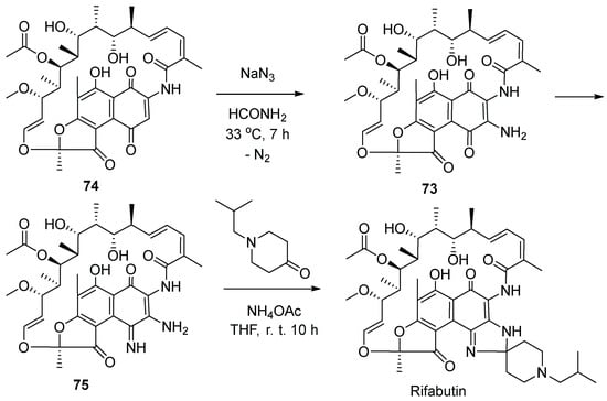 Rifabutin (Figure 9), a macrocyclic semisynthetic drug of the rifamycin family [44] was developed by the Italian drug company Farmitalia Carlo Erba, and received FDA approval in 1992 for the treatment of tuberculosis, as well as other bacterial infections such as Mycobacterium avium complex [45]. The drug works via the inhibition of the DNA-dependent RNA polymerase in bacteria, leading to a suppression of RNA synthesis and cell death [46].