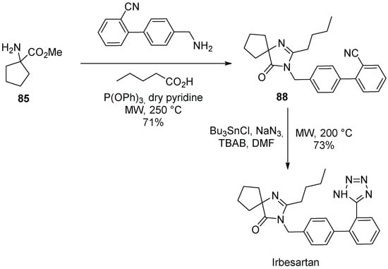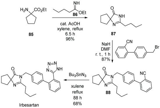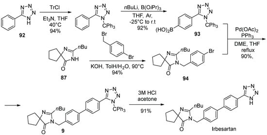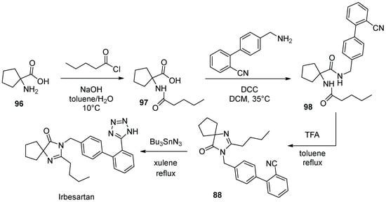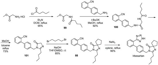 - Chen, Z.; Guo, Y.; Niu, H.; Wang, J.; Li, J.; Li, C.; Qiao, R. Development of a New Synthetic Route of the Key Intermediate of Irbesartan. Org. Proc. Res. Dev. 2022, 26, 2438–2446. [Google Scholar] [CrossRef]
