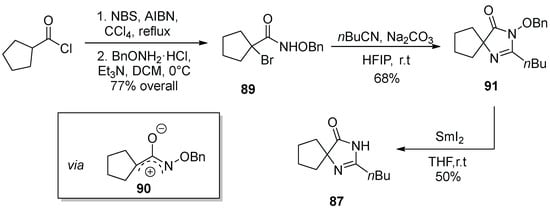 - DiPoto, M.C.; Wu, J. Synthesis of 2-Aminoimidazolones and Imidazolones by (3 + 2) Annulation of Azaoxyallyl Cations. Org. Lett. 2018, 20, 499–501. [Google Scholar] [CrossRef] [PubMed]