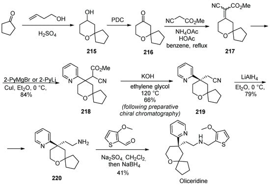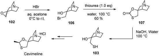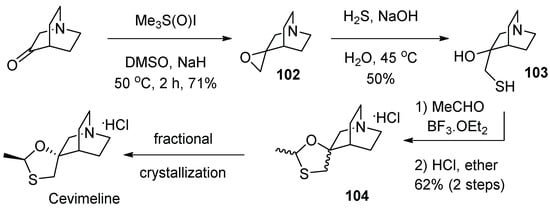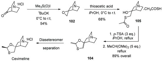 - Pramanik, C.; Patil, P.; Kotharkar, S.; Tripathy, N.K.; Gurjar, M.K. A new route to cevimeline. Tetrahedron Lett. 2013, 54, 3043–3045. [Google Scholar] [CrossRef]