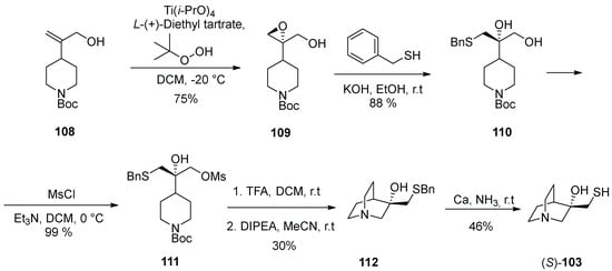 - Bös, M.; Canesso, R. EPC-synthesis of (S)-3-hydroxy-3-mercaptomethylquinucudine, a chiral building block for the synthesis of the muscarinic agonist AF1028. Heterocycles 1994, 38, 1889–1896. [Google Scholar] [CrossRef]