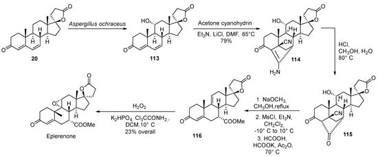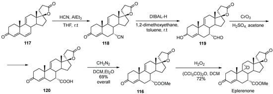- Zhang, B.; Chen, H.; Feng, H.; Li, Y. Stereoselective construction of a steroid 5a,7a-oxymethylene derivative and its use in the synthesis of eplerenone. Steroids 2011, 76, 56–59. [Google Scholar] [CrossRef]