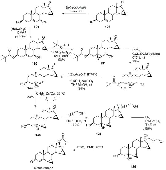 - Bittler, D.; Hofmeister, H.; Laurent, H.; Nickisch, K.; Nickolson, R.; Petzoldt, K.; Wiechert, R. Synthesis of Spirorenone- A Novel Highly Active Aldosterone Antagonist. Angew. Chem. Int. Ed. Engl. 1982, 21, 696–697. [Google Scholar] [CrossRef]