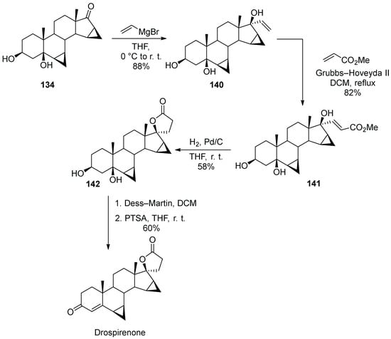 - Bandini, M.; Contento, M.; Garelli, A.; Monari, M.; Tolomelli, A.; Umani-Ronchi, A.; Andriolo, E.; Montorsi, M. A Nonclassical Stereoselective Semi-Synthesis of Drospirenone via Cross-Metathesis Reaction. Synthesis 2008, 2008, 3801–3904. [Google Scholar] [CrossRef]