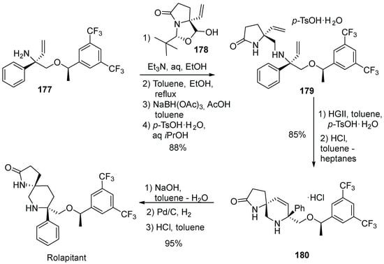 - Wu, G.G.; Werne, G.; Fu, X.; Orr, R.K.; Chen, F.X.; Cui, J.; Sprague, V.M.; Zhang, F.; Xie, J.; Zeng, L.; et al. Process and Intermediates for the Synthesis of 8-[{1-(3,5-bis-(trifluoromethyl)phenyl)-ethoxy}-methyl]-8-phenyl-1,7-diaza-spiro[4.5]decan-2-one Compounds. US Patent 9,249,144, 2 February 2016. [Google Scholar]