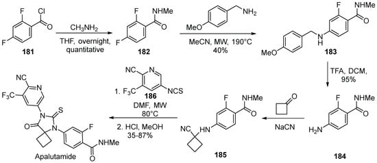 - Hughes, D.L. Review of Synthetic Routes and Crystalline Forms of the Antiandrogen Oncology Drugs Enzalutamide, Apalutamide, and Darolutamide. Org. Proc. Res. Dev. 2020, 24, 347–362. [Google Scholar] [CrossRef]