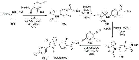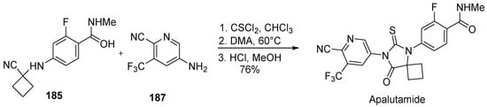 - Zheng, X.; Zhang, Y. Synthesis Method of Apalutamide and Its Intermediates. Chinese Patent CN108383749, 10 August 2018. [Google Scholar]