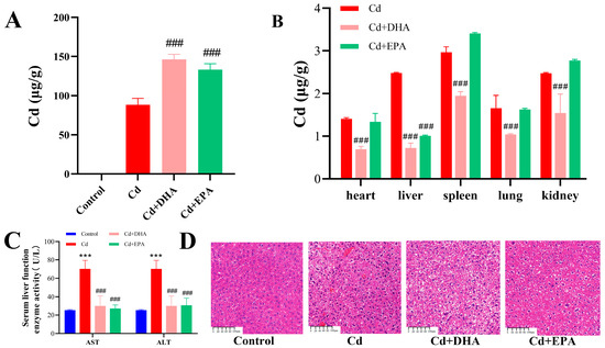 Effect of DHA on Cd content in Cd-exposed mice. (A) Cd content in feces. (B) Cd content in organs. (C) Serum AST and ALT activity levels. (D) Liver section. Magnification 10×; the reference line is 100 μm. *** p < 0.001 represented a significant difference compared with the control group. ### p < 0.001 represented a significant difference compared with the Cd group.
