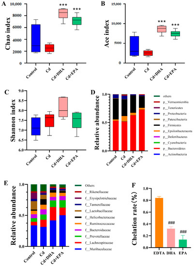 Analysis of the ability of DHA to reverse Cd-induced changes in gut microbiota and cause Cd chelation in mice. (A) Chao1 index. (B) Ace index. (C) Shannon index. (D) Relative abundance of top 10 gut microbiota at the phylum level. (E) Relative abundance of top 10 gut microbiota at the family level. (F) Determination of Cd-chelating properties of DHA and EPA via Cd-CAS liquid assay. *** p < 0.001 represented a significant difference compared with the Cd group. ### p < 0.001 represented a significant difference compared with the EDTA group.