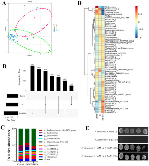 Effect of DHA on gut microbiota of Cd-exposed mice. (A) NMDS map of beta diversity of gut microbiota; (B) 97% similarity in the Upset diagrams of the OTUs in the control group, Cd group, and DHA-processing group; (C) the relative abundances of the top 10 gut microbiota at the genus level; (D) heatmap of gut microbiota abundance at the genus level; (E) sensitivities of P. distasonis to Cd evaluated: P. distasonis were spotted onto MRS medium.
