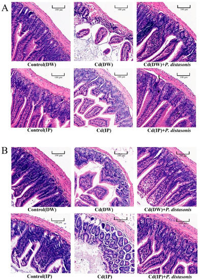 Effect of P. distasonis on the gut histopathological sections of Cd-exposed mice. (A) H&E-stained sections of mouse jejunum. (B) H&E-stained sections of mouse ileal tissue. The magnification is 20×, and the reference line is 100 μm.