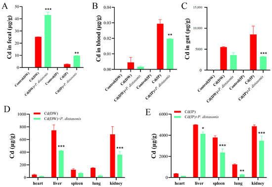 To assess the effect of P. distasonis on Cd excretion in Cd-exposed mice, Cd levels were determined in the feces, organs, and blood. Compared to the Cd group, the fecal Cd content of mice treated with P. distasonis was significantly increased (p < 0.001) (Figure 5A). The results indicate that P. distasonis could greatly promote Cd excretion in the feces of Cd-exposed mice. In the IP group, Cd contents in the blood and organs of the mice (except the heart) were inhibited to varying degrees after the addition of P. distasonis (p < 0.05). Cd levels in the liver and kidneys were significantly decreased in the DW group (p < 0.001), and no other significant differences were found (Figure 5B–E). These results indicate that P. distasonis can induce Cd excretion in the feces of Cd-exposed mice by reducing the contents of Cd in the blood and organs, thus reducing the absorption of Cd by the body.