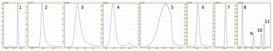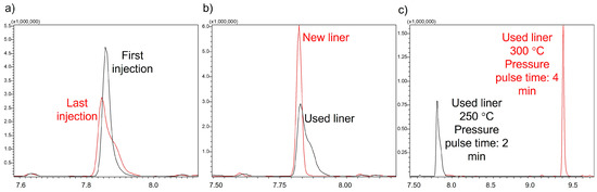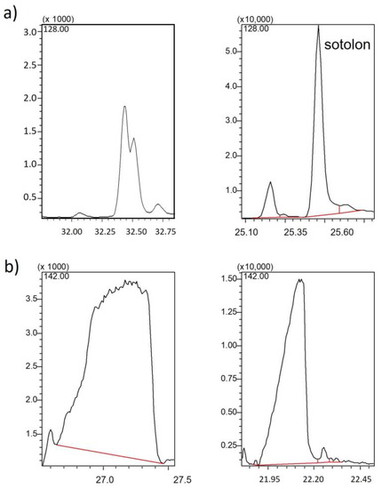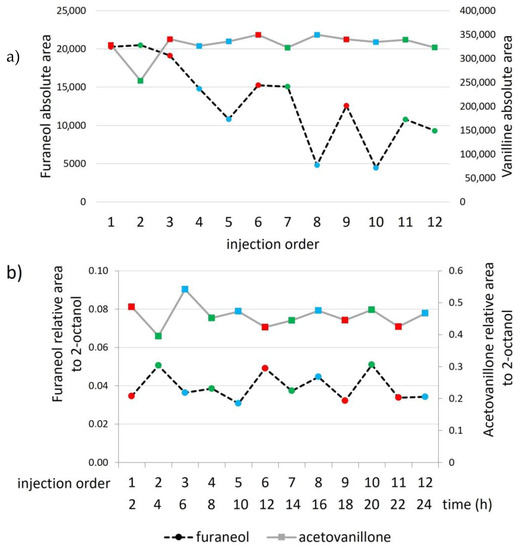 - Ethyl maltol and 3′,4′-(methylenedioxy)acetophenone addition to the initial sample. These compounds have similar chemical formulations as the analytes and, therefore, should perfectly imitate their behavior, particularly regarding the intermolecular interactions that they exert towards different matrix components. Furthermore, their addition before starting the extraction process allows the internal standards (IS) to undergo the same analytical process as the analytes, so it can make the signal of the analytes independent of the injected volume, in addition to small matrix differences, thus reducing matrix effects.