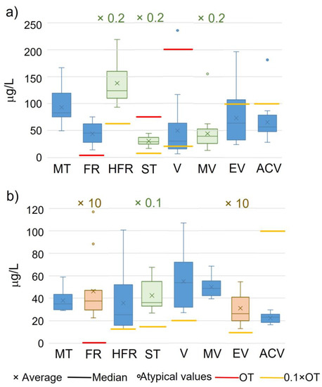 | Repeatability RSD (%) a | Reproducibility RSD (%) b | LD (μg/L) | LQ (μg/L) | OT (μg/L) | |||