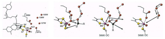 The 3D structure of the XO-related molybdenum-iron protein Dg AOR was analyzed in its desulfo-, sulfo-, oxidized, reduced, and alcohol-bound forms at different resolutions by Huber et al. [33]. A remarkable finding was the presence of a bound isopropanol inhibitor in the inner compartment of the substrate-binding tunnel, which was the inspiration for the mechanistic details of and reaction to aldehydes. The occupancy of the substrate-binding site by the isopropanol (an inhibitor), the observation of a buried water molecule as a source of O-transfer, and the conserved Glu 869 involved in catalysis were all crucial for the proposal of a mechanism. I include here (Figure 2) the first proposal for a complex with an aldehyde substrate close to Mo(VI), the enzyme/carboxylic acid product complex (Mo(IV)) and the intermediate, after product dissociation, with Glu 869 bound to Mo.