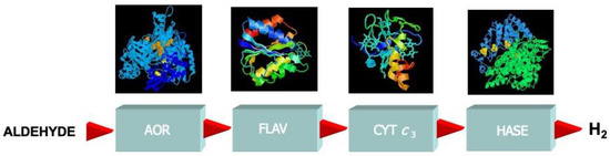 AOR was shown to be part of an electron-transfer chain comprising four different soluble proteins from Dg, with a total of 12 discrete redox centers, which can link the oxidation of aldehydes to the reduction of protons [4,46].