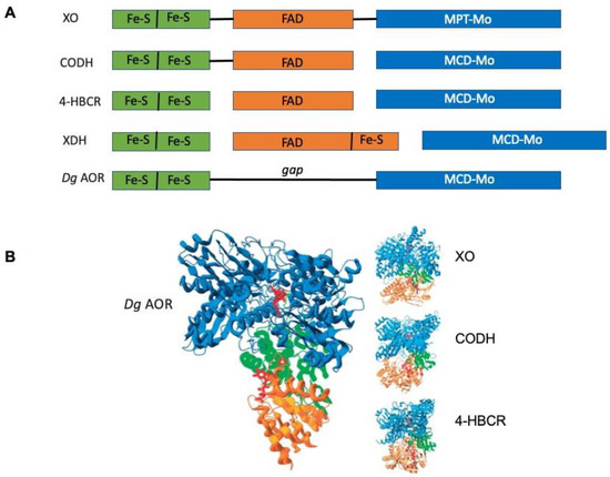 (A) Schematic representation of the domain sequence for the three enzymes XO, CODH, 4-HBCR (including an extra elongation of the β-subunit that binds, in addition to the FAD moiety, the [4Fe-4S] center), and AOR (homologies among molybdenum hydroxylases). The FAD domain is absent in the D. gigas aldehyde oxidoreductase. In R. capsulatus xanthine dehydrogenase and Bos Taurus XO, the iron–sulfur- and flavin-binding portions of the protein constitute one subunit (XdhA), and the molybdenum-binding portion a second (XdhB). In O. carboxydovorans CO dehydrogenase, the iron–sulfur centers are together in one subunit (CoxS), the flavin in a second (CoxM), and the molybdenum in a third (CoxL). A comparison with the R. capsulatus XDH domain sequence is also included (a variation in the XO domain theme). (B) Docking configuration for Dg flavodoxin and Dg AOR (left panel) compared with the structures of XO (top right), COD (center right), and 4-HBCR (bottom right). The colors correspond to the sequence homology schemes shown in Figure 1: green for FeS, orange for FAD and flavodoxin, and blue for MCD-Mo or MPT-Mo regions (adapted from [49]).