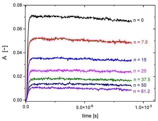 Pulse radiolysis of aqueous N2O-saturated solutions of 2 mM KSCN and various concentrations of Dex25-MA0.05, where n = [Dex25-MA0.05]/[SCN−]. Determination of rate constant of •OH radical reaction with Dex25-MA0.05 by competition method with SCN− as the competing scavenger. Kinetic traces at 480 nm (pulse duration 7 ns, dose per pulse 15 Gy).
