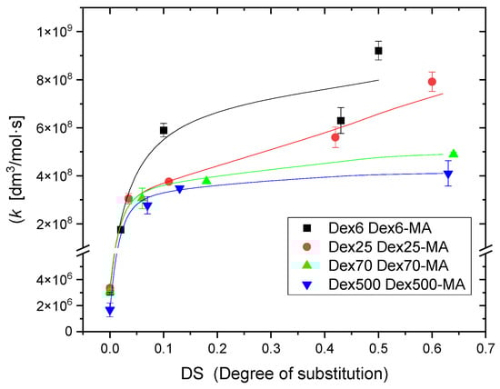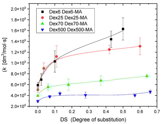 Each experiment was performed three times and average values were calculated. Summarized results presenting the rate constants for dextrans of various molecular weight, non-substituted and at various degrees of substitution, are shown in Figure 3.