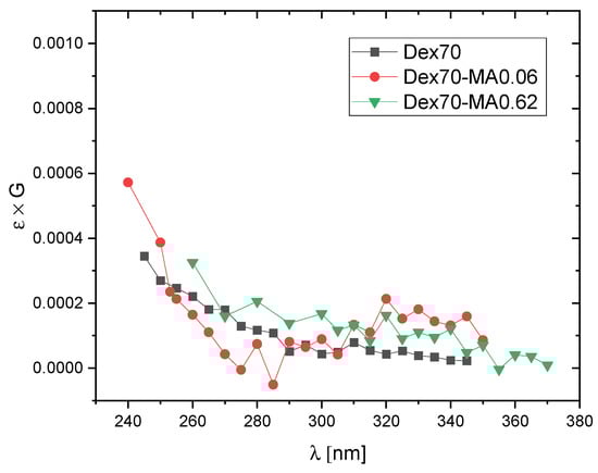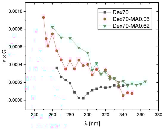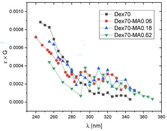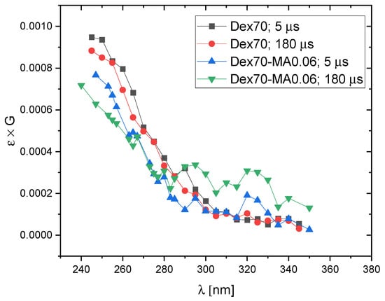 Spectra recorded at 180 μs after the pulse (Figure 10) show that in the 300–350 nm range absorbance in Dex-MA solutions is stronger than in case of unsubstituted Dex. However, similarly as in the case of •OH-induced reactions, there is no much difference in absorbance between Dex70-MA0.06 and Dex70-MA0.62; in both cases almost all have reacted with methacrylate group and the product concentration is controlled mainly by the quantity of hydrated electrons, directly dependent on the dose, which was the same for both samples.