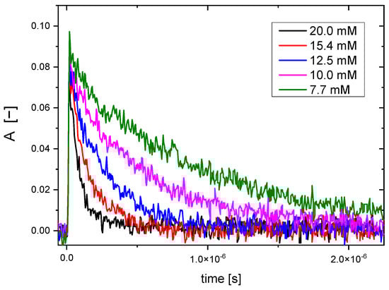 For each polymer concentration, absorbance of (SCN)2•− at 480 nm after the electron pulse was recorded. An exemplary set of kinetic traces for various polymer concentrations is shown in Figure 2.